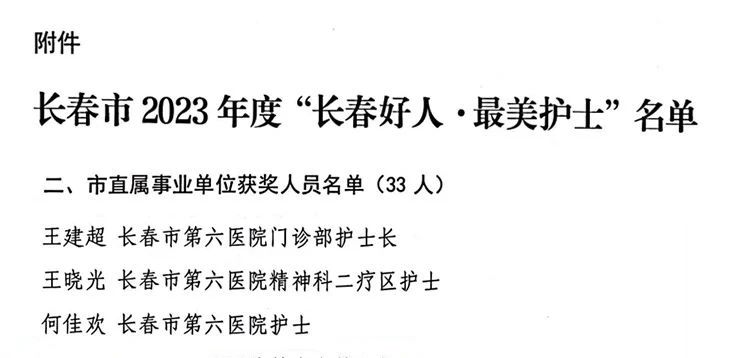为弘扬南丁格尔精神,充分发挥先进典型的模范带动作用,值此“5·12”国际护士节来临之际,中共长春市委宣传部、长春市精神文明建设指导委员会办公室、中共长春市卫生健康委员会党组联合组织开展了“长春好人·最美护士”推荐评选活动。经各单位公开推荐、组织考察,小妲己直播下载 王建超、何佳欢、王晓光获得2023年度“长春好人·最美护士”荣誉称号。