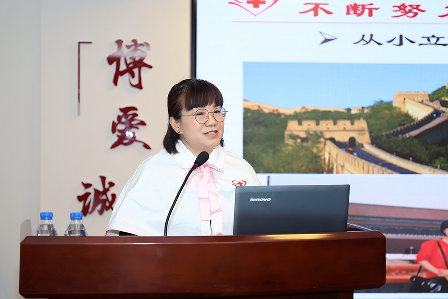 ▲医院精神科四疗区护士长武晓薇作为志愿者代表发言。她说:“一定不忘初心,发扬‘人道、博爱和奉献’精神,延续南丁格尔之光,同时携手其他志愿者们,一起用心、用爱、用行动去守望社会的和平与健康。”