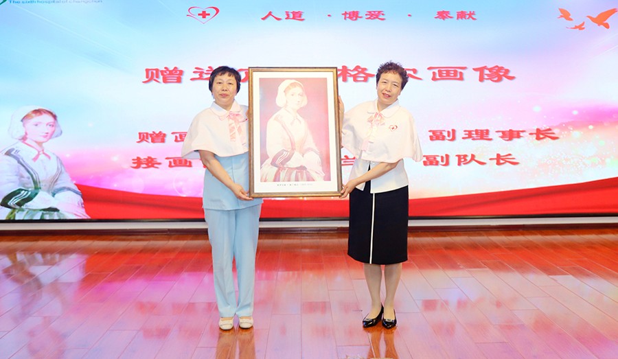 ▲张桂英副理事长向医院志愿护理服务队副队长、护理部主任孙兰英赠送“南丁格尔”画像
