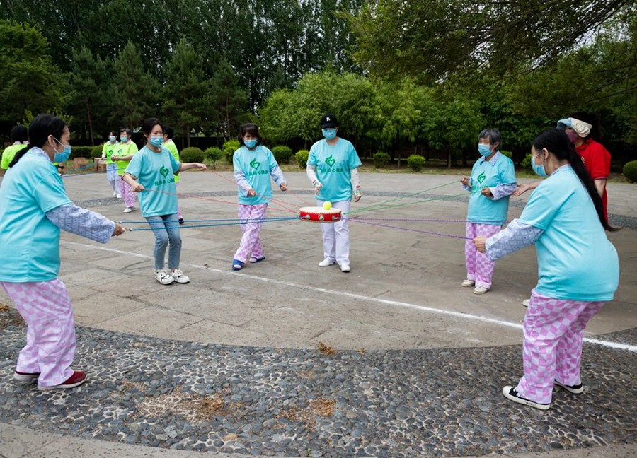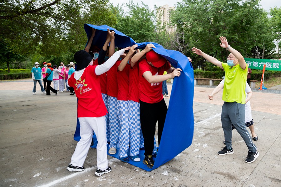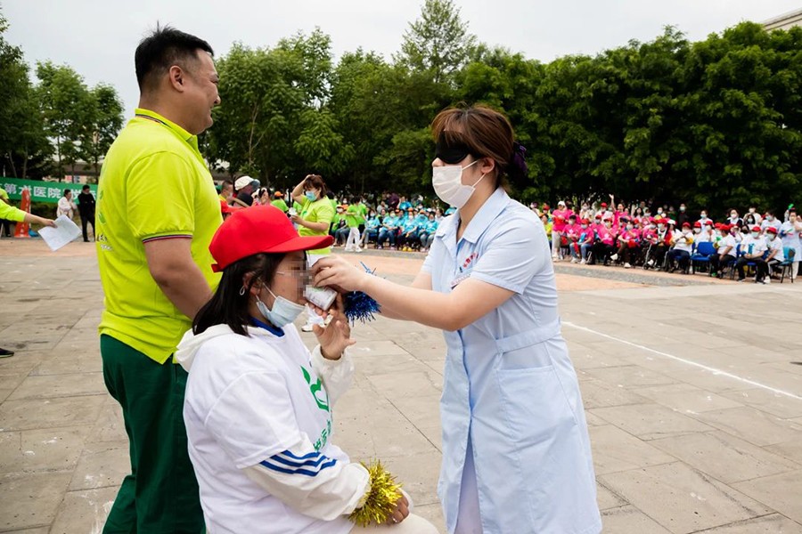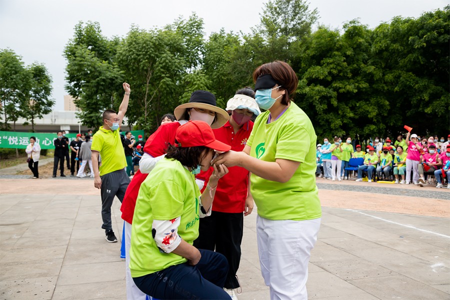暖心照护,是一种新颖的医患互动游戏,蒙上眼睛的医护人员在休养员的指挥下,健步如飞的躲开层层关卡,将手中的酸奶稳稳地送到休养员口中,大家在其乐融融的氛围中瞬间拉近了彼此距离。