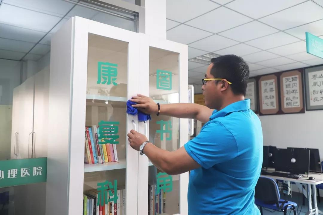 每天5:30起床,6:15到公交站,7:00赶到班车站点,7:45准时到达医院,7:55布置好一楼彩虹咖啡吧再去图书馆,两年多了,他从不迟到早退、从不请假缺席,康复患者统计、借阅图书信息,职工借阅登记、4000册图书管理,小海把每一项工作都做得有条不紊,在工作中锻炼、康复,他的精神状态越来越好。