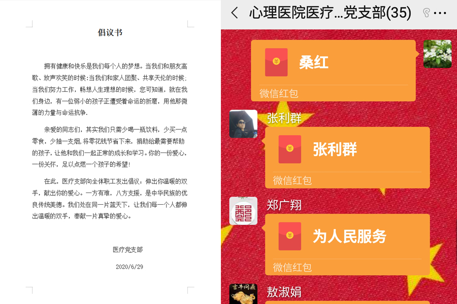 6月30日,医疗党支部召开党员大会,全体党员面对党旗庄严宣誓,“不忘初心、牢记使命 ”以实际行动积极践行党的根本宗旨,守初心、践初心,争做新时代优秀党员。医疗党支部的护士因孩子有病,导致家里生活比较困难,党支部了解情况后,号召党员开展了爱心捐款公益活动。桑红院长知道消息后带头捐款,支部党员也积极捐款献爱心,募集的善款于近日送交到护士手中,为度过难关献上微薄之力。