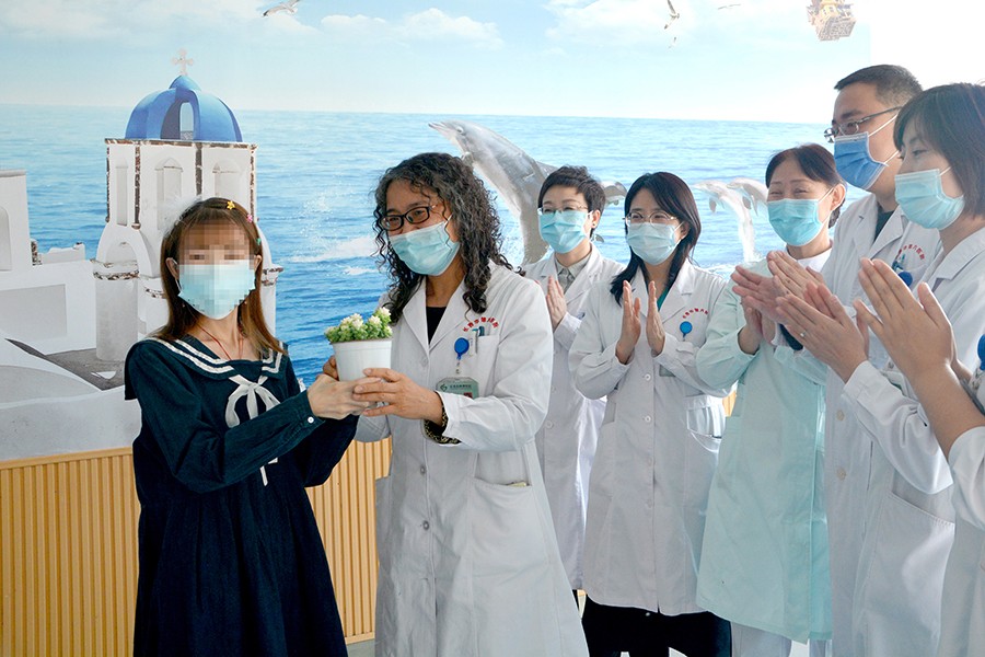 高兴地看见琳琳体重增长到30公斤,彭新贤主任和张亚东医生也兑现了当初的承诺,送给她一份小礼物——一盆生机勃勃的小绿植。手捧着礼物,琳琳十分高兴,她的双颊也泛起了红晕,含着眼泪说:“是你们让我重生,我以后会珍惜生活,珍惜生命。”