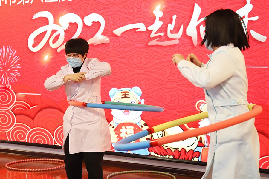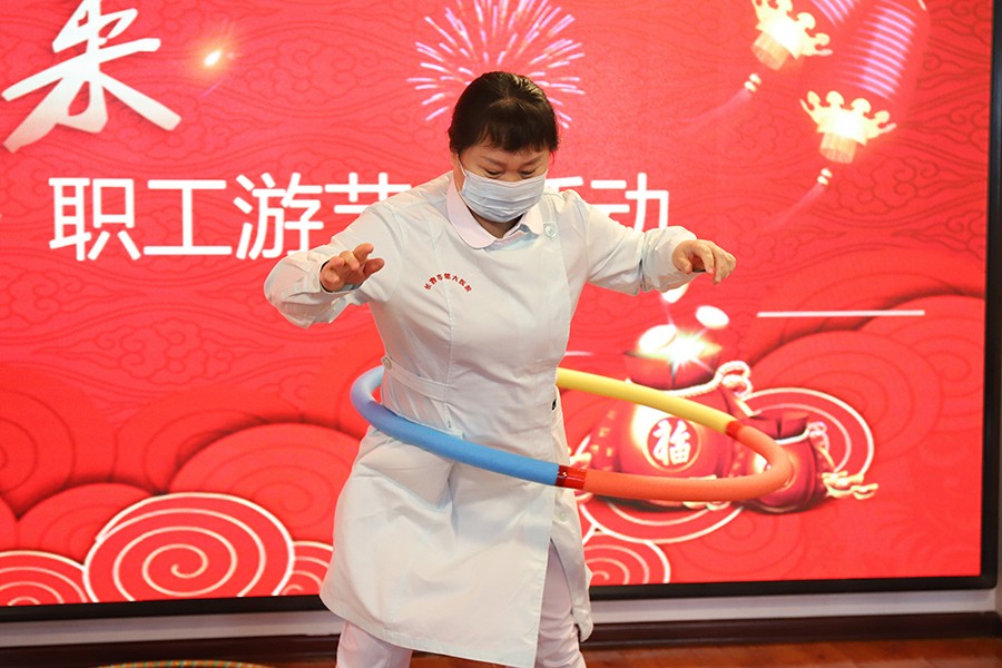 现场最热闹的项目要属“快乐呼啦圈”了,规则是两人一组,谁转的时间长谁获胜。在比赛现场,心理科五疗区护士张妍玥表现抢眼。虽然对手十分强大,但她仍凭借着灵活的腰身和稳定的转速,完胜对手。赛后,面对着众人的喝彩,她也忍不住“自夸”起来:“摇呼啦圈是我特长,可以挑战全院……”众人跟着大笑。同是心理科五疗区的护士刘雪松更是战绩非凡,在跟同事交流的时候说:“也没费什么劲,就拿了四个一等奖和四个二等奖!”