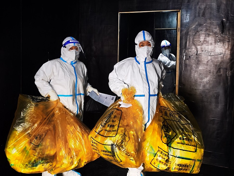 3月19日晚,团队被紧急调离农博园方舱医院,转战城开美御隔离点。在那里,侯代双先后承担了三脱间消杀、医疗垃圾处置,隔离人员药品与物品配发,协助送餐、转运、核酸采样等工作。