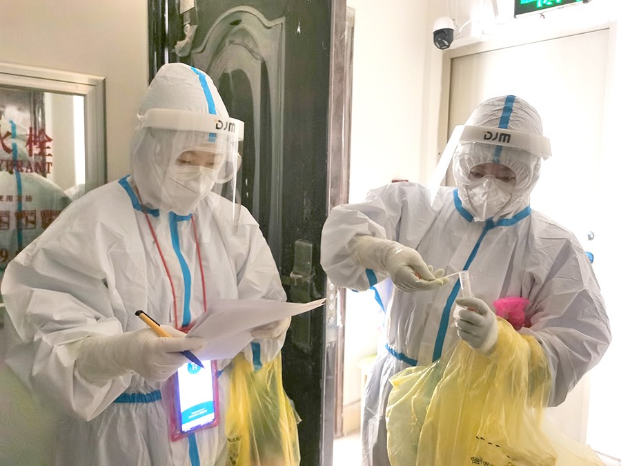 ▶主动承担核酸采样任务,毫无怨言。4月18日,由于工作人员调动,核酸采样人员紧缺,她主动承担起核酸采样的工作任务,第一天就负责隔离点南区的采样工作。面对患者较多、工作压力增大,她毫无怨言。