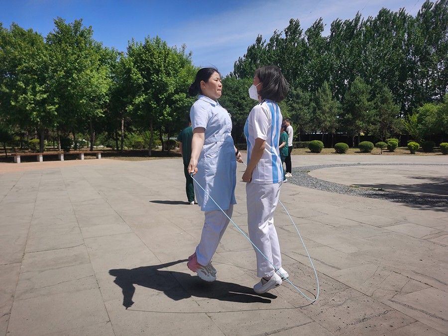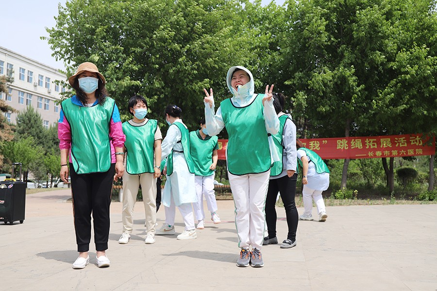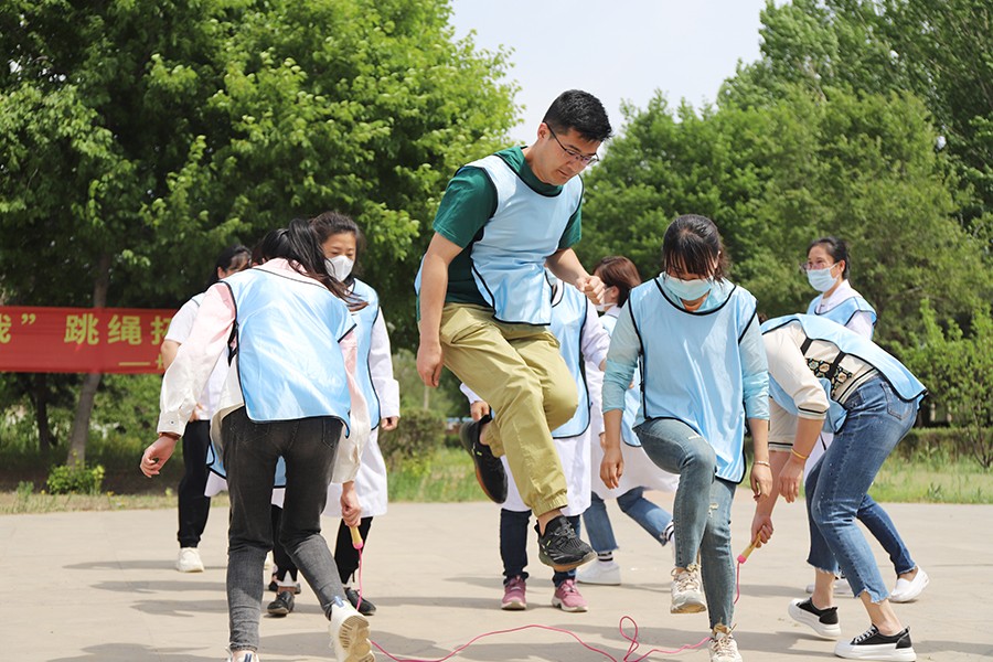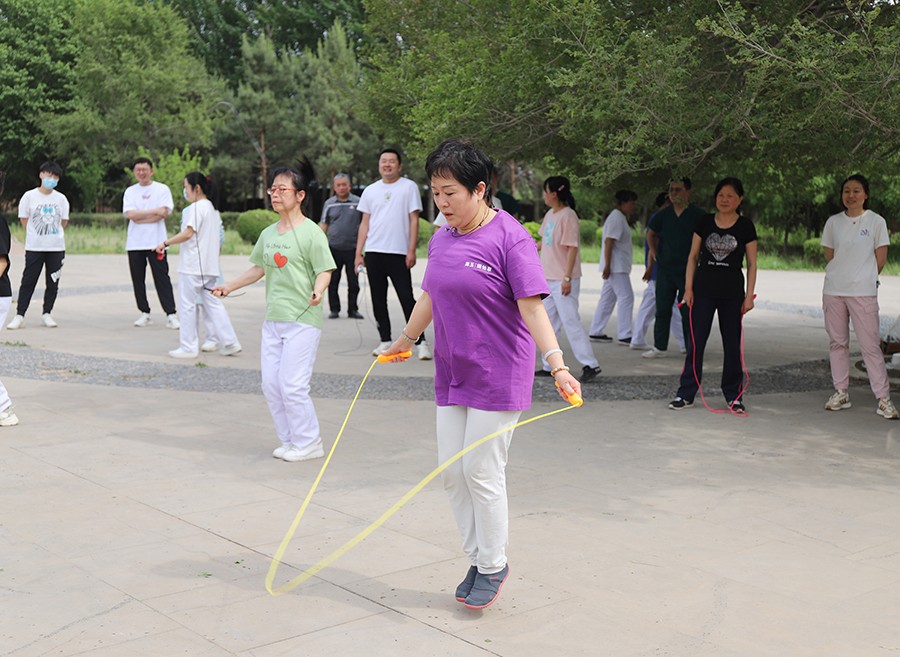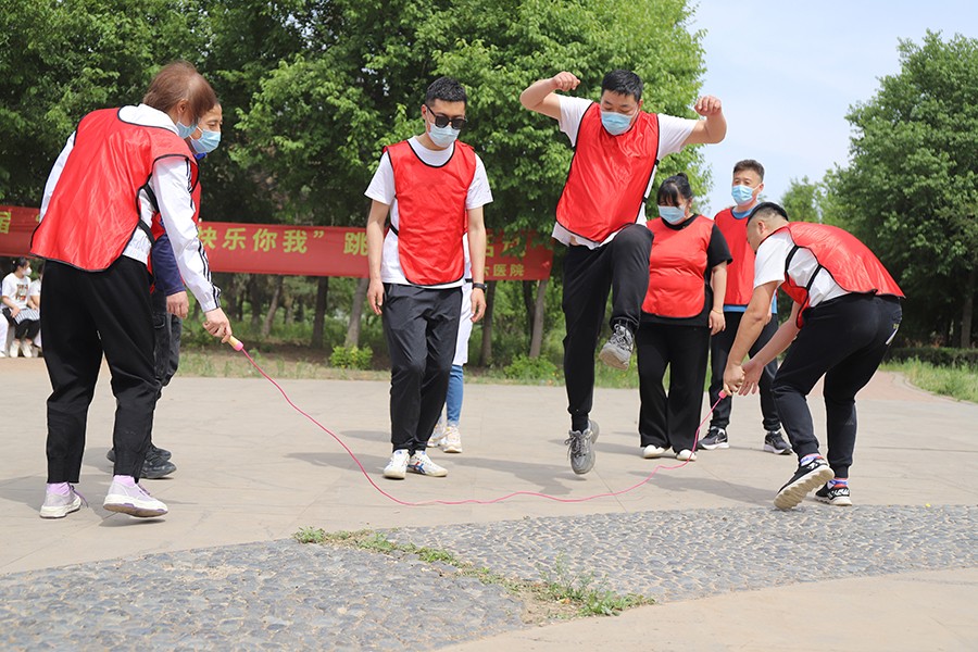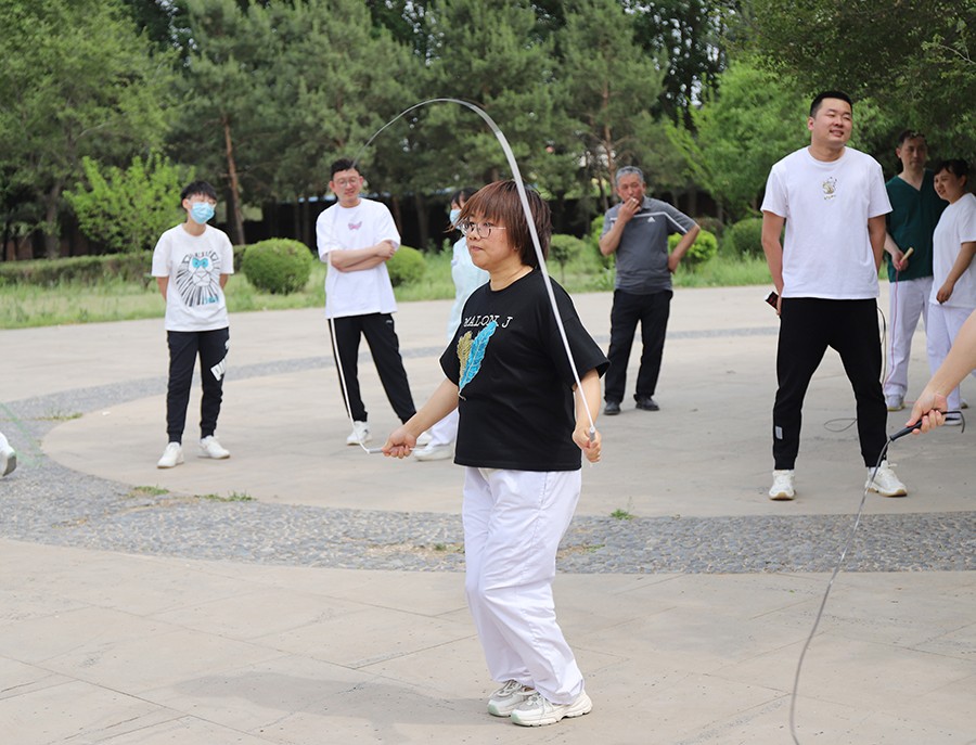到了各显“绳”通的环节,女职工们在跳绳比赛中展现出“巾帼不让须眉”的拼劲和独领风骚的气势。她们双脚跳、单脚跳、双摇跳,个个身轻如燕,跳跃在翻飞的绳圈中,像不知疲倦的跳跃的音符,奏响了专属六院人的夏日旋律。据说有的选手提前几天就已经开始在家练习,上场后更是与队友积极配合、争分夺秒,速度和成绩也在紧张的氛围中被不停地刷新。单人跳、双人跳,“绳如虹飞转,人似蝶蹁跹” 的花式变化和热闹场面,是不是也让屏幕前的你,摩拳擦掌,跃跃欲试?!
