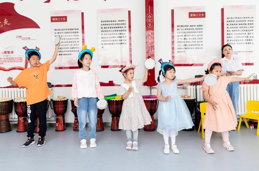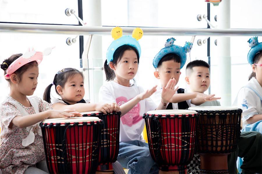 随着一阵清脆、空灵的双响筒声响起,一场精彩纷呈的多元化艺术疗愈体验活动正式开启。在康复治疗师和志愿者的辅助下,孩子们逐渐学会铃鼓、音筒、非洲鼓等乐器的演奏方法,并在老师的鼓励引导下,跟上韵律和节奏,独立使用奥尔夫音乐乐器完成“听觉艺术”(音乐)的整个演奏。