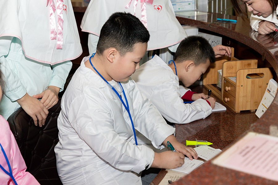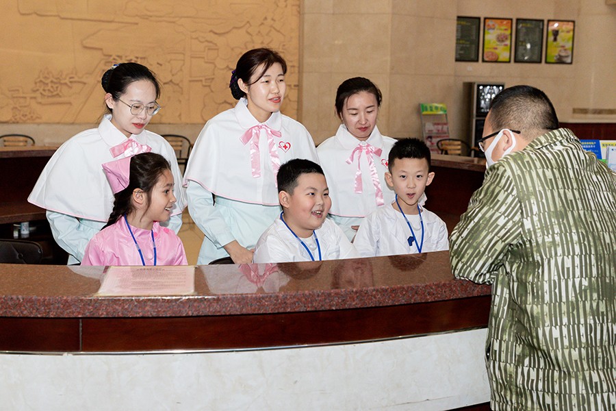 在门诊一楼大厅,小志愿者们分为两组,在工作人员的带领下,认真聆听工作要领,并依次体验导诊和安检的工作。一张张认真且幼小的脸庞,吸引了来往患者及家属的关注,也收获了许多的夸赞。