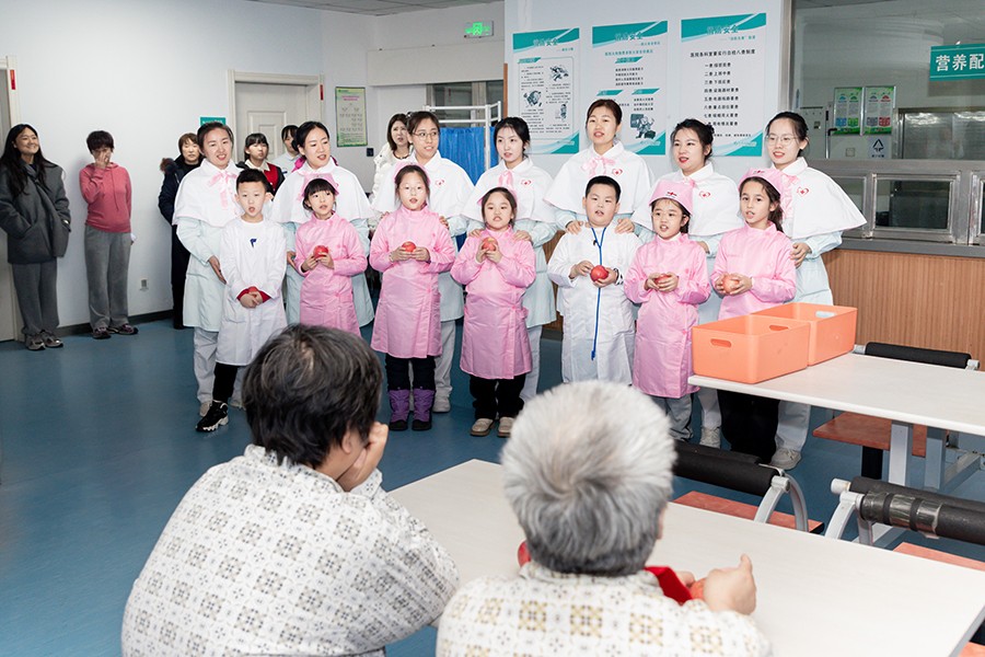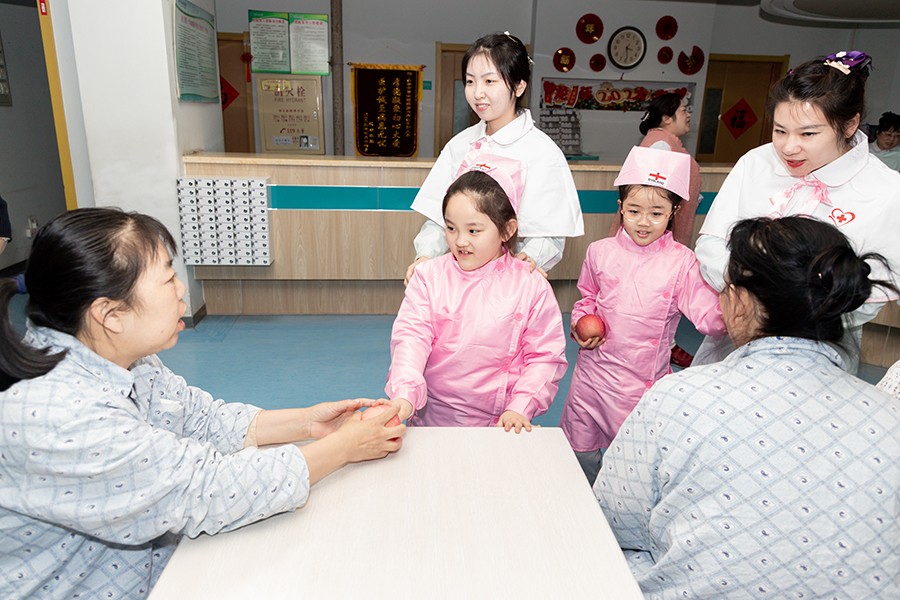 “祝你们早日康复!”在精神科六疗区,小志愿者们用自己的压岁钱为患者购买的苹果,送到患者手上,并向他们送上诚挚的祝福。