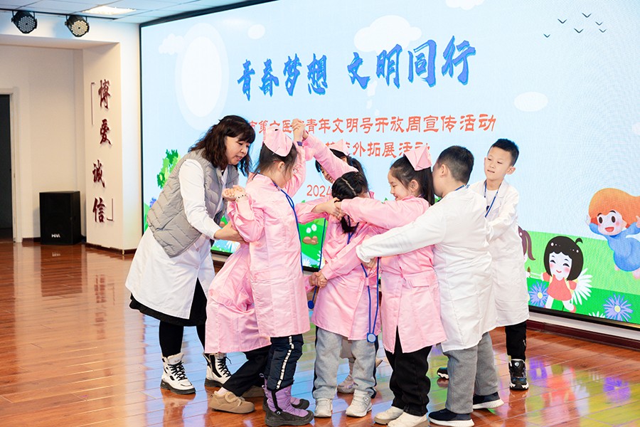 游戏是孩子的最佳学习方式。现场,心理科二疗区主治医师刘丽卓带领小志愿者们进行心有千千结”团体心理游戏活动,旨在让小志愿者们体验到团队合作的真谛和力量,享受团体合作的快乐,体会在人际交往中沟通、谦让和信任的重要性,为他们的心理健康发展增添了积极力量。