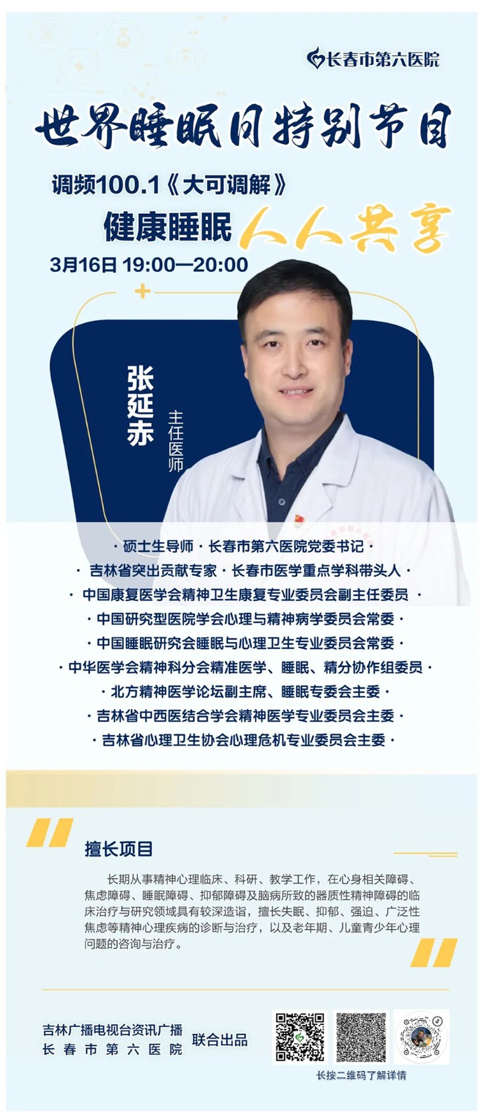 为提高大众对健康睡眠关注度,加大科普宣传力度3月16日,小妲己直播下载 党委书记、睡眠学科带头人张延赤教授做客吉林广播电视台咨讯广播《大可调解》世界睡眠日特别节目,敬请关注!
