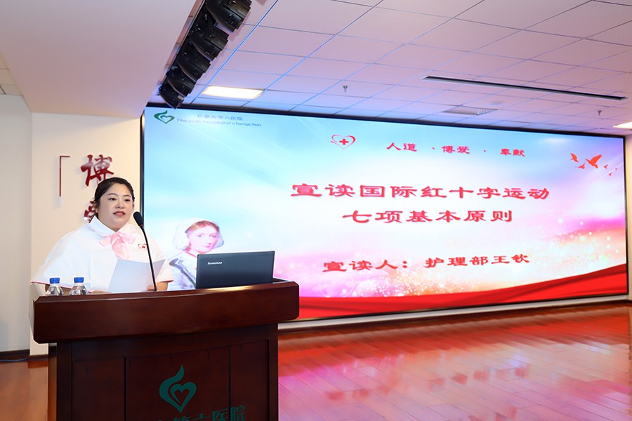 ▲医院护理部干事王钦宣读《国际红十字运动七项基本原则》