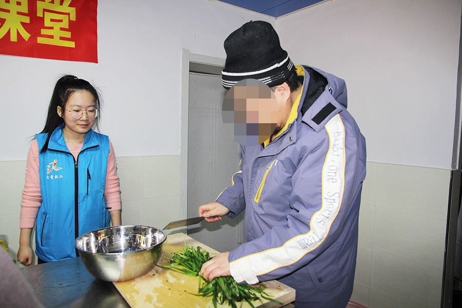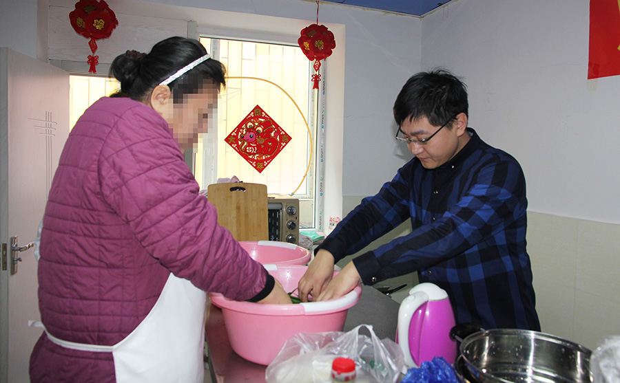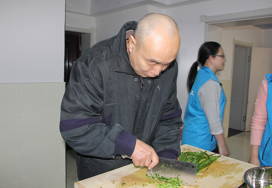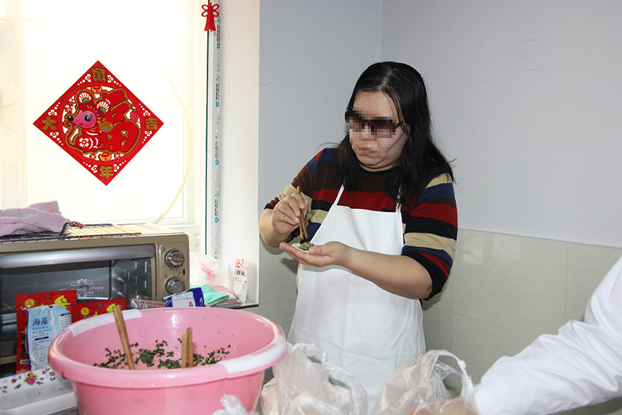 采购归来,大家就开始分工协作,摘菜、洗菜、切菜、切肉、拌馅、包饺子,井井有条。有些不会做饭的学员刚开始躲在后面看热闹,精防医生把他们推到菜板前面,要求每个人都亲自动手,学会切菜和包饺子。老杨在家从来没包过饺子,在其他家属的指导下,包出了自己人生第一个饺子,高兴得不得了,拿着饺子给年轻的小健看。大家一边包饺子,一边彼此交流着近况,完全是一幅阖家欢乐的新春景象。
