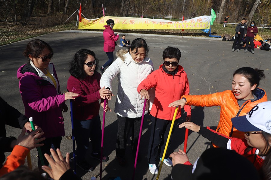 “1、2,走……1、2,走……”“手往上抬,别往前带……”每组10人,围成一圈,向“不倒森林”项目挑战,得保证人走杆不倒。走一步,手摁住,别紧张,大家找准配合度。这是一次整体行动,每个人都不能掉队,更不能有差错,不但考验个人技术,更考验团队合作能力。“好紧张啊,不过感觉很好。一起完成一件事,这种快乐是溢于言表的。”职工们说,团结、协作的精神一直是六院人传承,这个游戏恰好把这种传承发挥出来。