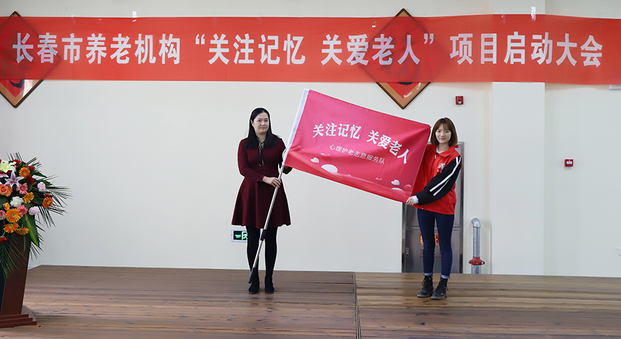 长春市养老机构“关注记忆 关爱老人”项目将由社工志愿者团队联合34家养老机构及长春市第一社会福利院、长春市第二社会福利院共同参与开展。会上,李诗群副处长为“关注记忆 关爱老人”项目志愿团队授旗。