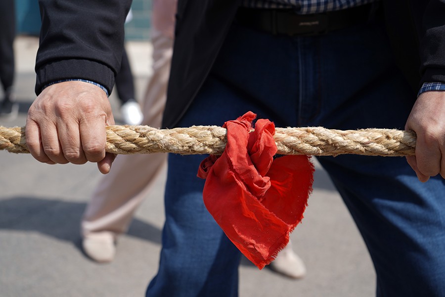现场,随着裁判员的一声哨响,又一轮的比拼开始,参赛队员们个个精神抖擞,团结一心,奋力拼搏,口号响亮。双方队员紧握麻绳,大家身体后仰,脚顶着脚,使出浑身力气,奋力地拉动绳子,口号声时疾时徐、时抑时扬、此起彼伏、不肯间歇,绳子中间那根红色的布带一会向左,一会向右,牵动着双方队员的心,洋溢着团结的力量。