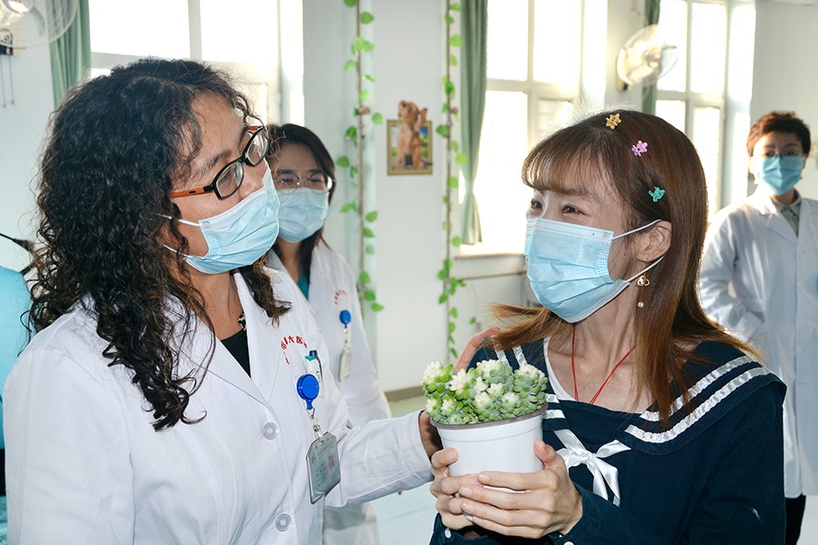 高兴地看见琳琳体重增长到30公斤,彭新贤主任和张亚东医生也兑现了当初的承诺,送给她一份小礼物——一盆生机勃勃的小绿植。手捧着礼物,琳琳十分高兴,她的双颊也泛起了红晕,含着眼泪说:“是你们让我重生,我以后会珍惜生活,珍惜生命。”