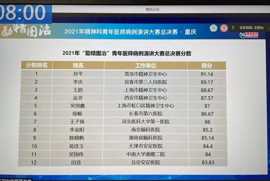 病例演讲逐真知,青年医师展风采。由中华医学会杂志社及中华精神科杂志主办的“励精图治”2021年精神科青年医师病例演讲大赛总决赛,于2021年12月22日在重庆举行。中南大学湘雅二医院李凌江教授、北京大学第六医院于欣教授任大会主席。上海市精神卫生中心陈俊教授、中南大学湘雅二医院张燕教授、南京医科大学附属脑科医院姚志剑教授、武汉市精神卫生中心李毅教授和上海市精神卫生中心王振教授共同担任大会评审。小妲己直播下载 心理科一疗区(睡眠障碍诊疗中心)主治医师徐畅荣获大赛三等奖。