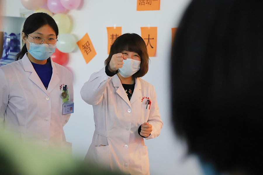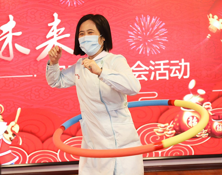 现场最热闹的项目要属“快乐呼啦圈”了,规则是两人一组,谁转的时间长谁获胜。在比赛现场,心理科五疗区护士张妍玥表现抢眼。虽然对手十分强大,但她仍凭借着灵活的腰身和稳定的转速,完胜对手。赛后,面对着众人的喝彩,她也忍不住“自夸”起来:“摇呼啦圈是我特长,可以挑战全院……”众人跟着大笑。同是心理科五疗区的护士刘雪松更是战绩非凡,在跟同事交流的时候说:“也没费什么劲,就拿了四个一等奖和四个二等奖!”