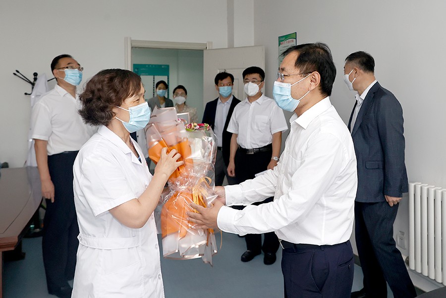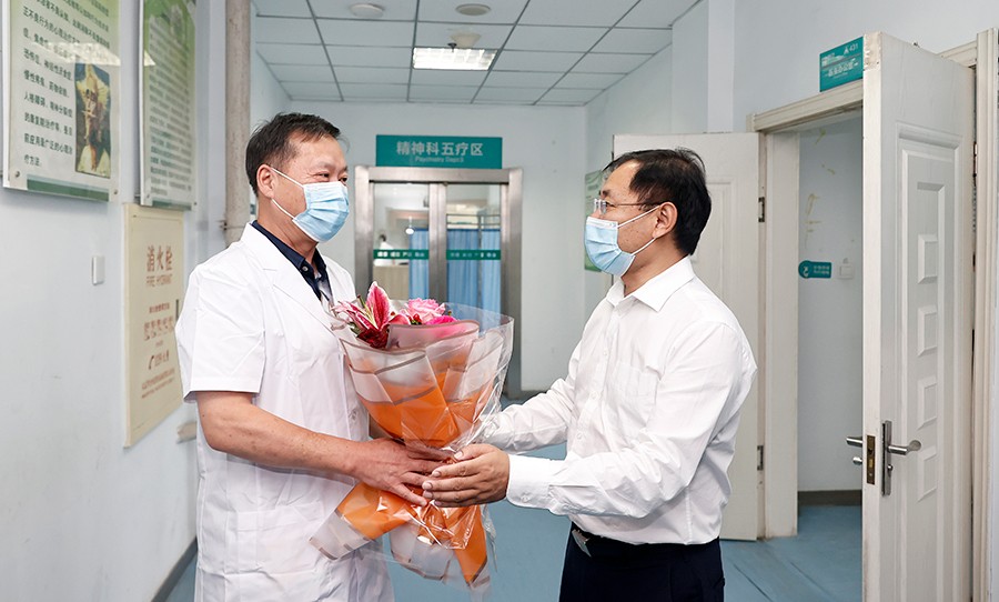 在心理科二疗区、精神科五疗区和六疗区,慰问一行人看望了3位敬业奉献的医师代表燕丽娟主任、张近春主任和马桂萍主任,并送上了鲜花,送上真诚的节日祝福。手捧鲜花,带着祝福,每一位医师都更加坚定自己的信念。未来,他们将全力以赴、坚守岗位,守护百姓身心健康。