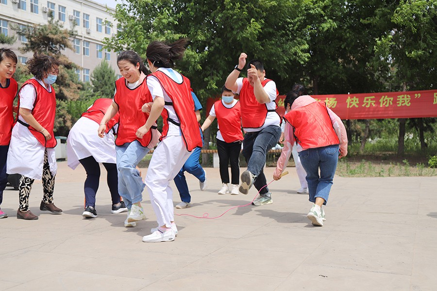 到了各显“绳”通的环节,女职工们在跳绳比赛中展现出“巾帼不让须眉”的拼劲和独领风骚的气势。她们双脚跳、单脚跳、双摇跳,个个身轻如燕,跳跃在翻飞的绳圈中,像不知疲倦的跳跃的音符,奏响了专属六院人的夏日旋律。据说有的选手提前几天就已经开始在家练习,上场后更是与队友积极配合、争分夺秒,速度和成绩也在紧张的氛围中被不停地刷新。单人跳、双人跳,“绳如虹飞转,人似蝶蹁跹” 的花式变化和热闹场面,是不是也让屏幕前的你,摩拳擦掌,跃跃欲试?!