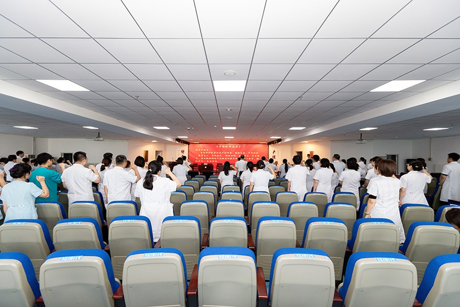 “我宣誓:我志愿献身人类的健康事业;自觉维护医学的尊严和神圣……”在董勇副院长的领誓下,医师们举起右手庄严宣誓,重温医者誓言,不忘医者初心。字字铿锵有力、句句道入心间的坚毅声音回荡在会场中,这不仅展示了新时期医务工作者坚定守护百姓生命健康的信心与决心,也表明了六院人用自己的实际行动在平凡的工作岗位上诠释医者的责任和担当。