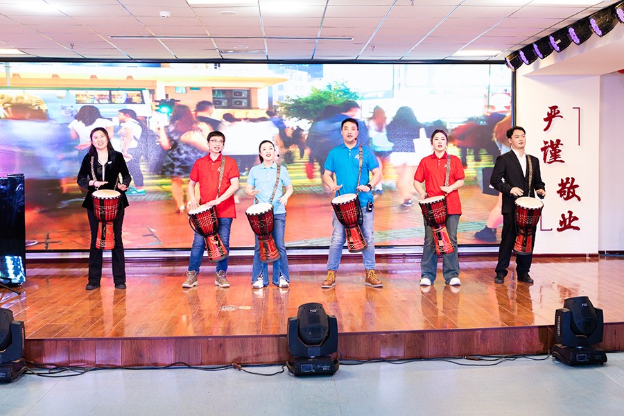鼓乐滔滔、红浪阵阵。在擂鼓者时缓时急的鼓点声中,舞者手中的龙形彩带宛若一条条身姿矫健、翻腾飞舞的中国龙上下翻飞。蕴含中国传统文化的开场龙鼓舞带来的欢乐与震撼,瞬间点燃全场气氛,新春联欢会就在这热闹的氛围中正式拉开帷幕。