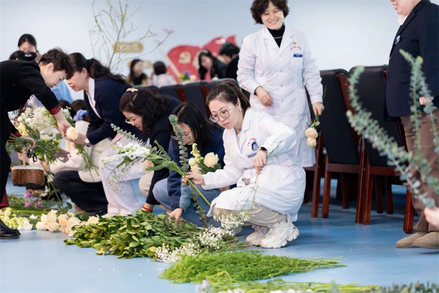 随后,女职工们跃跃欲试开始动手创作。构思、修剪、选择搭配,原本普通的花材在大家的精心布置下煜煜生辉,在花香四溢的多功能厅中,一张张幸福的笑脸掩映其中。随着一束束错落有致的作品出现在疗区、诊室、走廊,一位精神科医师捧着作品笑着说道,“插花如育人,既要修枝剪叶的魄力,更需静待花开的智慧。就像我们治愈患者的过程一样,需要耐心与巧思。”