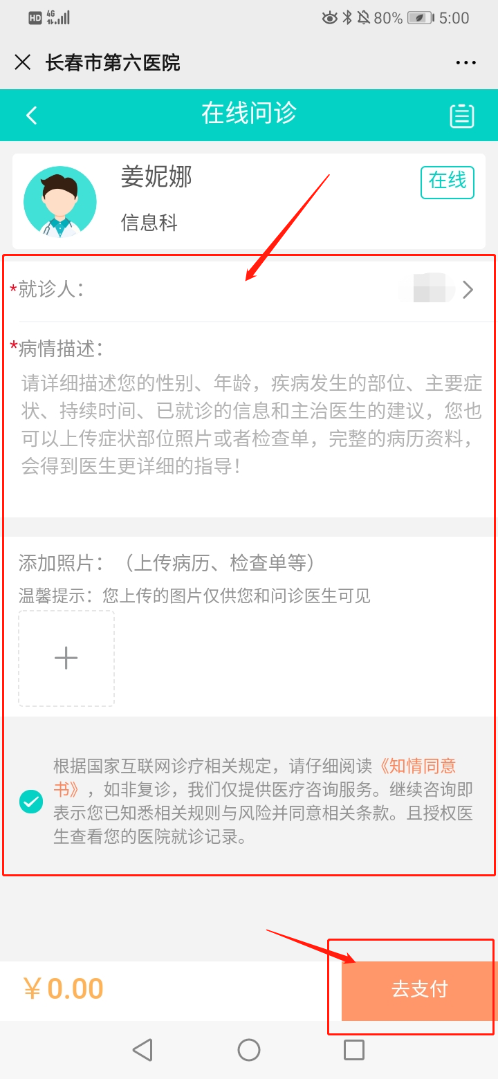 6.添写就诊人相关资料,病情描述及上传病历、检查单,完成后点“支付”进行问诊